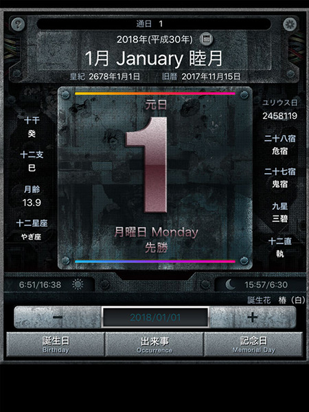 株式会社マックスマウスは、インターネットを通じた企業 / 法人のデジタルマーケティング活動を幅広く支援し、Webやモバイルを用いた販促および広報などのコンサルティング、企画提案からデザイン、開発、制作、運営まで、幅広い領域でソリューションを提供している企業だ(https://www.maxmouse.co.jp/)。本アプリは、新暦(年月日)、皇紀(年月日)、旧暦(年月日)などに対応。月齢や日の出と日の入りの時刻、六曜 / 九星 / 十二直 / 二十八宿などの暦注、当日が誕生日の有名人や過去の出来事や記念日といった各種の“その日に関する情報”も表示できる。