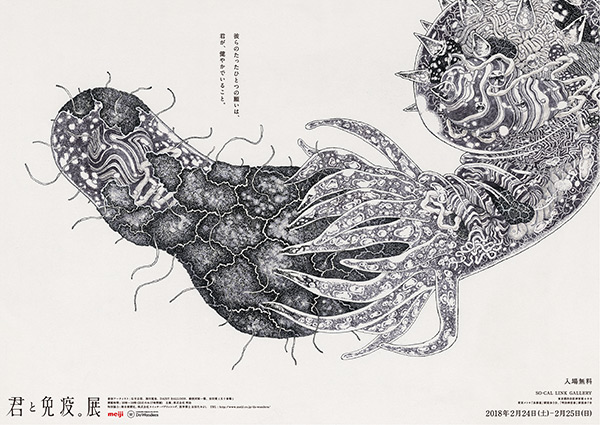 株式会社明治は「免疫」のメカニズムを楽しく学ぶ免疫力啓発プロジェクト「Do Wonders(ドゥー・ワンダーズ)」を開始した(http://www.meiji.co.jp/do-wonders/)。その第1弾の取り組みとして、2018年2月24日(土)と2月25日(日)の2日間にわたり、表参道のSO-CAL LINK GALLERYで「君と免疫。展」を開催する。「君と免疫を、アートでつなぐ」をコンセプトにした体験型アート展。5組のアーティストとコラボレーションし、五感で楽しむアートとして「免疫」が再構築されている。