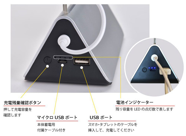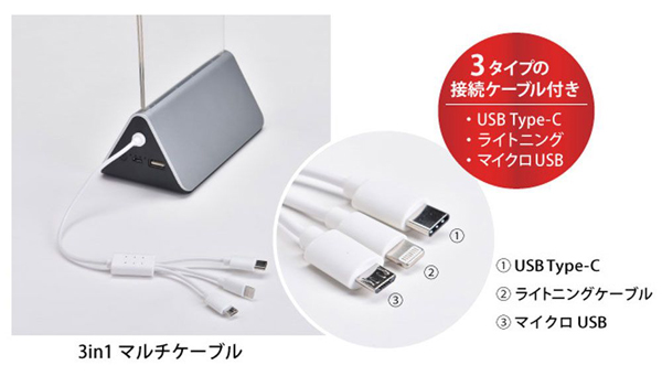 「menu-ba C」はメニュースタンドの台座部分に設置されたケーブルとUSBポートから最大でスマホ4台までの同時充電が可能。電池容量は10,000mAhと大容量で、充電残量を確認できるインジケーターもついており、3in1ケーブル付属でmicroUSB、ライトニング、TypeCとあらゆるモバイル機器に対応する。