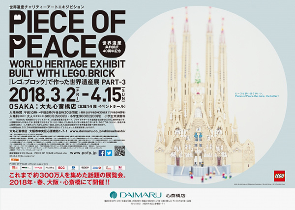 2018年3月2日(金)から4月15日(日)まで、大丸心斎橋店 北館 14Fのイベントホールにて、「世界遺産チャリティーアートエキジビション PIECE OF PEACE-『レゴ ブロック』で作った世界遺産展 PART-3-」が開催される。時間は10:00~20:30(最終日は18:00閉場 / 入場は閉場30分前まで)で、入場料は大人600円 / 小学生300円 / 小学生未満無料。入場料とグッズ売り上げの一部は、日本ユネスコ協会連盟が行う世界遺産活動へ寄付される。