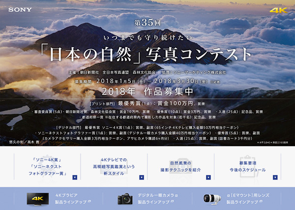 株式会社朝日新聞社と全日本写真連盟と森林文化協会は、ソニーマーケティング株式会社の協賛を受けて、第35回「日本の自然」写真コンテストを開催中。2018年3月30日(金)まで、作品の応募を受け付けている。風景や動植物、人間の営みなどをストレートに表現した作品を募集。プロ / アマ不問で誰でも応募でき、今回から部門がリニューアルされて年齢制限も撤廃されている(ただし「ソニーネクストフォトグラファー賞」は1987年4月1日以降生まれの30歳以下が対象)。