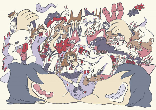 キャラクターを主体とする同氏の作品の幅は広く、さまざまなコンテクストが登場。“目や顔が歪んだキャラクターシリーズ”は、実際に嫌悪感や恐怖感を得た対象である当事者たちの顔をシリコンで立体にし、鉄球などの重りで“制裁”を下した後にランダムに伸ばした表情をモチーフとしている。また、“妖怪たちがキャラクターを囲うシリーズ”は、ペットの死から着想を得たもの。従来の妖怪とは反転し、“モノノ怪”に反した“ヒトノ怪”として、キャラクターの側に寄り添っては無機質な表情で慰労してゆく様が表現されている。