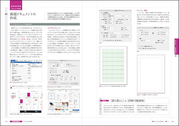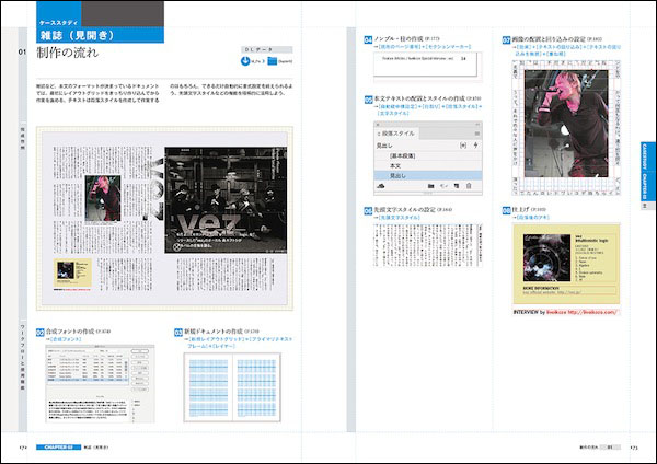第2部「ケーススタディ」では、実際に印刷物を制作する上での手順を、いくつかの制作物を基に解説していく。「文芸書」のシンプルな紙面の組版、ビジュアル重視の「雑誌(見開き)」ページ、膨大な量の繰り返し要素を扱う「カタログ」ページ、情報量の多い要素をレイアウトする「旅行パンフレット」、「特色2色の印刷物」の、5つの作例の具体的な作成手順を紹介。初心者はもちろん、仕事でInDesignを使っている人にも、非常に役立つ内容が詰まった一冊となっている。