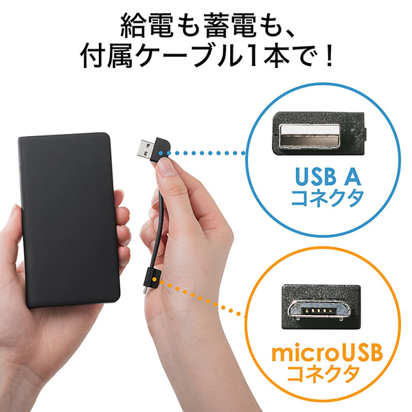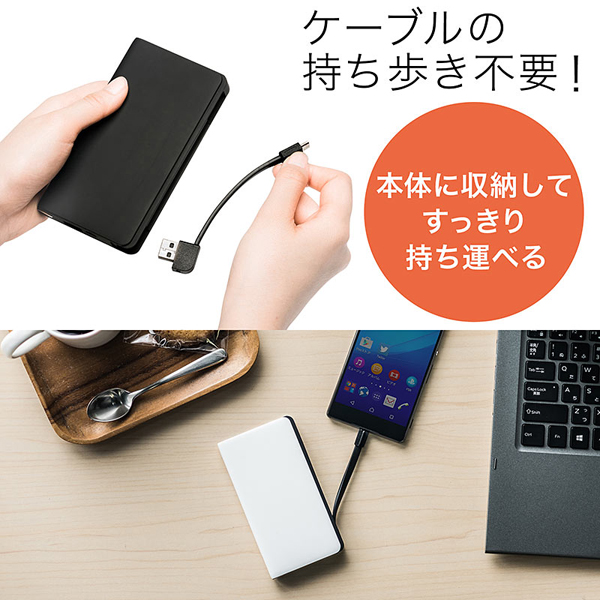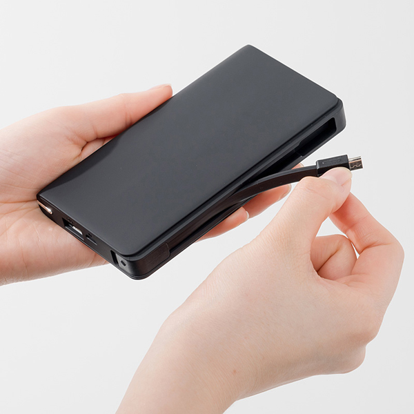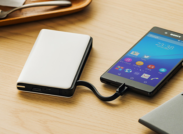 同製品は、サイド部分にmicroUSBケーブルを内蔵したモバイルバッテリーだ。充電ケーブルは着脱可能で、バッテリーからスマートフォンへの給電にも、バッテリー本体への蓄電にも利用可能。使用しないときは、ケーブルとモバイルバッテリーが一体化するので、カバンやポケットに収納しやすく、スマートに持ち運ぶことができる。