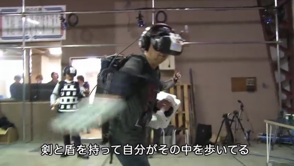 本コンテンツでは、VRヘッドマウントディスプレイを装着し、剣や盾に見立てたデバイスもユーザーが持ち、ドラクエのRPG世界を体験できる。戦闘では、剣でスライムを斬る感触、火の呪文のメラを放つ感覚などが体感できる。