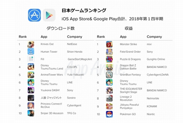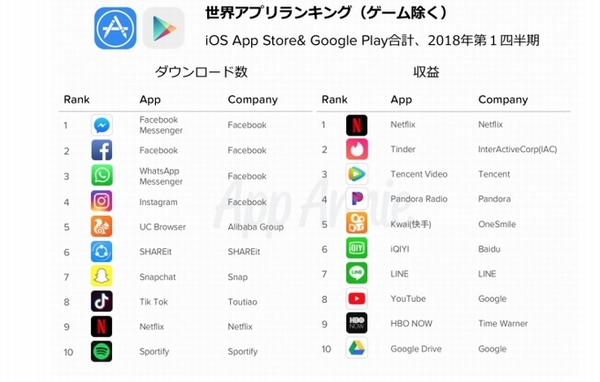 そのほか、ゲーム以外のアプリでは世界収益が「Netflix」「Tinder」「Tencent Video」、世界ダウンロードが「Facebook Messenger」「Facebook」「WhatsApp Messenger」の順。Facebookは先ごろの情報流出問題を受け、今後ダウンロード数がどう推移するかに注目だ。