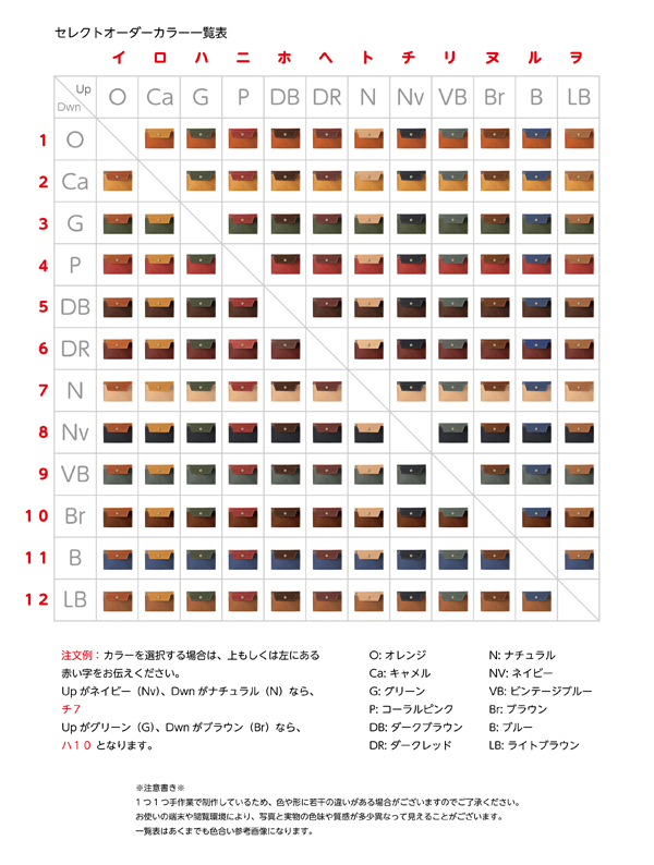 スタンダードカラーは、コーラルピンク×ダーくブラウン、オレンジ×ブルー、ビンテージブルー×ネイビー、ライトブラウン×ブラウン、キャメル×グリーン、ナチュラル×ダーくレッドの6種類。セレクトオーダーでは12色のレザーから自由な組み合わせを選ぶことが可能で、同色の組み合わせを除くと、全部で12×11=132パターンのオーダーが可能となっている。