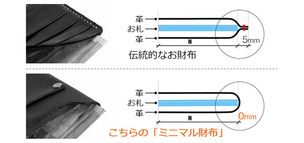 まず表面のホックを外すと、手前のポケットに収納されたカードと、中央の紙幣を取り出すことが出来る。中央部は二枚折りした紙幣がピッタリと納まる深さになっているので、紙幣が沈んでしまうこともない。さらに縫い目をなくすことで商品全体の小型化も実現している。