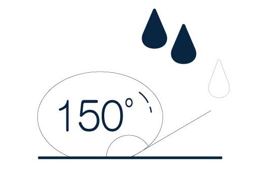 同製品は、生地表面のマイクロ・ナノ構造が生地と水滴の間に空気層を作りだし、一振りするだけで雨粒が滑り落ちる“超撥水”の雨傘だ。マイクロ・ナノ加工を施した生地の上で、雨粒はほぼ真球となり、傘生地と水滴の接触角は150度以上に(従来品の場合は130度ほど)。丸くなった雨粒が、軽く一振りするだけで転がり落ちる魔法のような撥水力を実現した商品である。