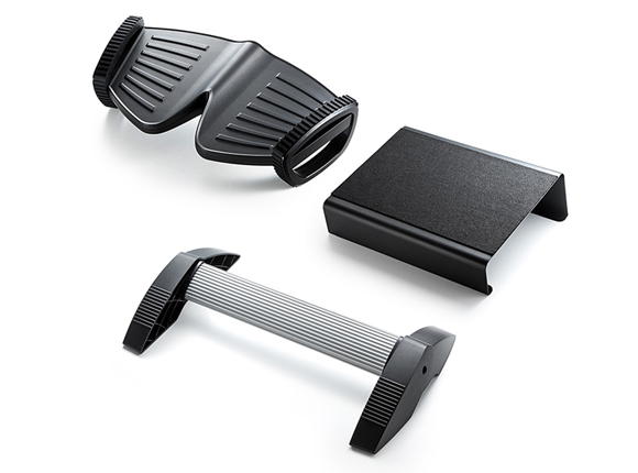 「100-FR012」は、竹踏みのような形状で、足裏を刺激できるアルミ製フットレスト。正面から使用すればリラックスできる快適な使い心地に。前後をひっくり返すと鋭角な面が足裏を刺激する竹踏みフットレストへと変化する。フレーム底部には滑り止めが付いており、ズレを防止。立てかけて収納することも可能である。サイズは約W578×D345×H97mmで重量:約1.31kg。価格は3,685円(税抜)。
