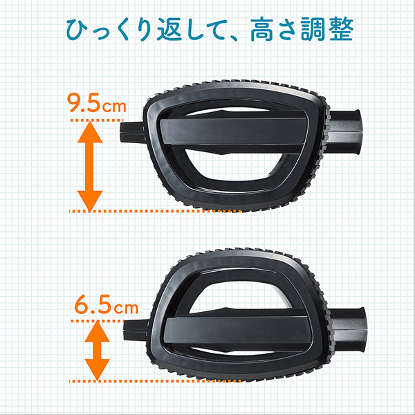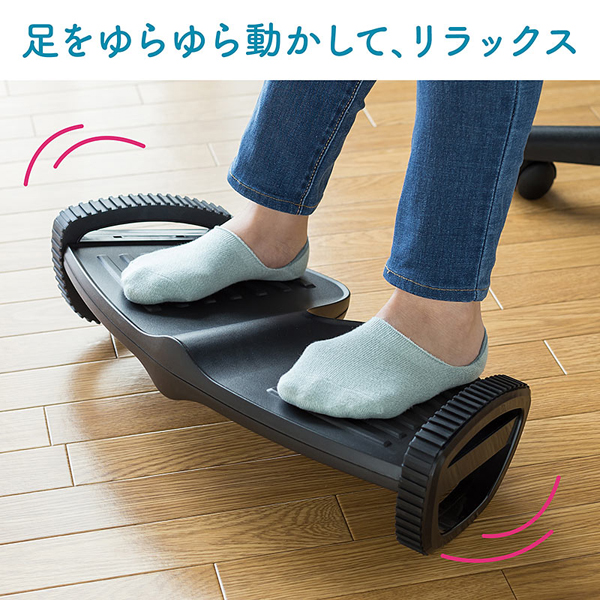 「100-FR009」は、自分の足でゆらゆらと角度を調整しながら使用するタイプで、上下を入れ替えると2段階(6.5cm/9.5cm)の高さ切り替えができる。床と接する左右の脚部は、ゴム素材を使用しているため滑りにくくなっており、使用しないときは立てて省スペースに収納しておくことが可能。サイズは約W502×D290×H135mmで重量は約1.14kg。価格は販売価格:3,222円(税抜)