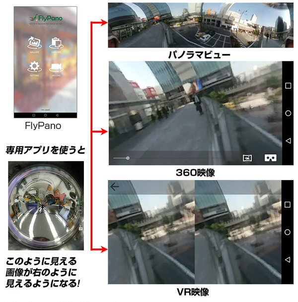 専用アプリが付属しており、ボタンひとつで写真も動画も撮影が可能。撮影したデータはパノラマレンズで撮影したような広い画角のパノラマビュー、通常の画角で見られ指で視点を簡単に動かせる拡大ビュー、VRゴーグルを装着して動きに合わせて視点が変化するVRビューなどで楽しむことができる。SNSにアップロードしてシェアすることも可能だ。