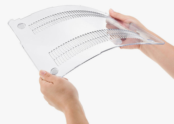 底面カバーには複数の孔が設けられており、カバーを使用し続けていても本体には熱が溜まりにくい。ThunderboltやUSB、ヘッドホンジャックなどの各種のポート類の部分も、カバーを装着した際に塞がれてしまうことがないオープン設計だ。底面に4個の滑り止めパーツが付いており、キータイピング時などにズレを防止する効果もある。重量は276g。