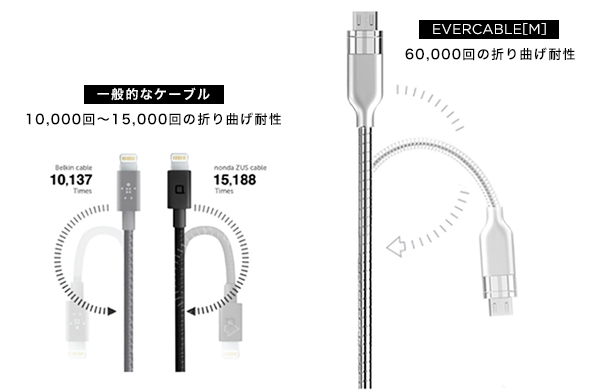 同製品は、美しく高い強度を持つステンレススチールを採用した充電ケーブルだ。特殊な構造によって約60,000回の折り曲げに耐え、その強度は、一般的に強度が高いといわれているケーブルのさらに4~6倍に相当する。