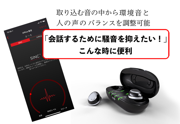 同製品は、様々な環境下で“聴こえ”をサポートする、イヤホンを超えた革新的なウェアラブルオーディオである。環境に合わせた最適な「聴こえ方」を生み出すSINC(スーパーインテリジェントノイズコントロール)™技術により、「外の音を取り込む」ことや「取り込んだ音や声の調整」をすることが可能。スマートフォンとはBluetoothで接続し、専用のスマホアプリ(無料)を使って「聴こえ方」をカスタマイズすることができる。