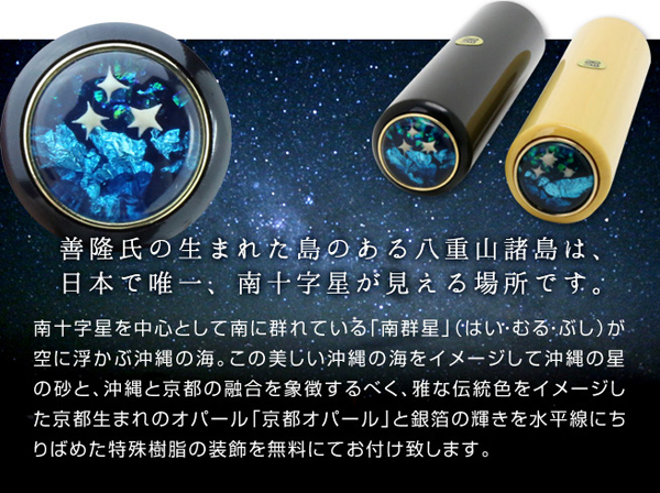 印材は「芯持黒水牛(印面・朱/金)」「薩摩本柘(印面・黒/金)」の2種類、大きさは13.5ミリ、15ミリ、16.5ミリの3種類から選ぶことができ、牛もみ革の印鑑ケース付き(赤/黒/茶)。天の部分には京都生まれの「京都オパール」と「銀箔」を使用した「八重山諸島から見える南十字星」の装飾を施すことも可能で、まさに「セキュリティ」と「デザイン性」が両立したオンリーワンの印鑑となっている。