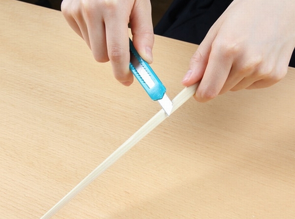 箸木地をカッターなどで自分の好みの細さ、意匠にカットして、サンドペーパーで整え、蜜蝋をかけてツヤを出すことができる。