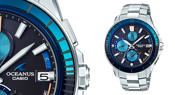 機能面では、標準電波受信機能による時刻修正に加え、Bluetooth®でのスマートフォンリンクによる時刻修正機能を搭載。スマートフォンアプリ「OCEANUS Connected」との連携により、ワールドタイムの時刻を約300都市から簡単に設定できるようになっており、これにより都市コード表記のないすっきりとしたフェイスデザインを実現している。すべての機能を厚さ11.4mm のスリムケースに収めた、薄く美しいフォルムも魅力である。