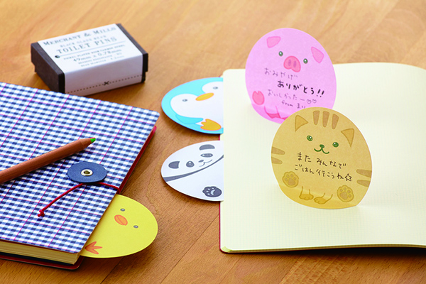 てにのるアニまるメモは、手のひらサイズの丸型メモ。カシメ金具で止めてあるので、ページをスライドして使用する。1セット90枚となっているが、メモのデザインは30枚ごとに切り替わるため、3種類のデザインを楽しむことができる。価格は320円(税抜)。