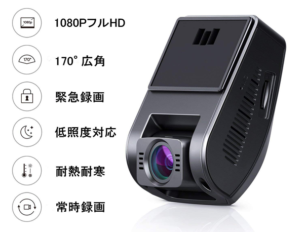 同製品、1080フルHDの高画質、夜間撮影、ループ録画、Gセンサー搭載など、多彩な機能を搭載しながらも驚きの低価格を実現したドライブレコーダーだ。170°の超広角視野で4車線幅の道路でも死角を作らず、視野の広い映像を取得。レンズの向きを上下とも90°調整できるので、フロントガラスの傾斜度が違う車でも最適な角度で設置することができる。