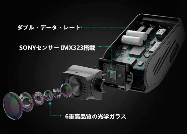 さらに6重の高品質光学ガラスを採用することで、超高精細のFHD1080Pの解像度で鮮明な映像を撮影し、暗い夜道にも対応。低照度条件の夜間の運転でも強力な性能を維持し、クリアな映像を撮影してくれる。