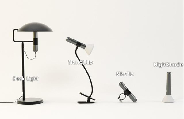 「DeskLight」は、間接照明によりムードのある空間を作り出すデスクライトモジュール。傘の部分が可動式になっており角度を変えることができるとともに、FlashLightの装着位置を上下にスライドさせることで、光の表情も調整できるようになっている。