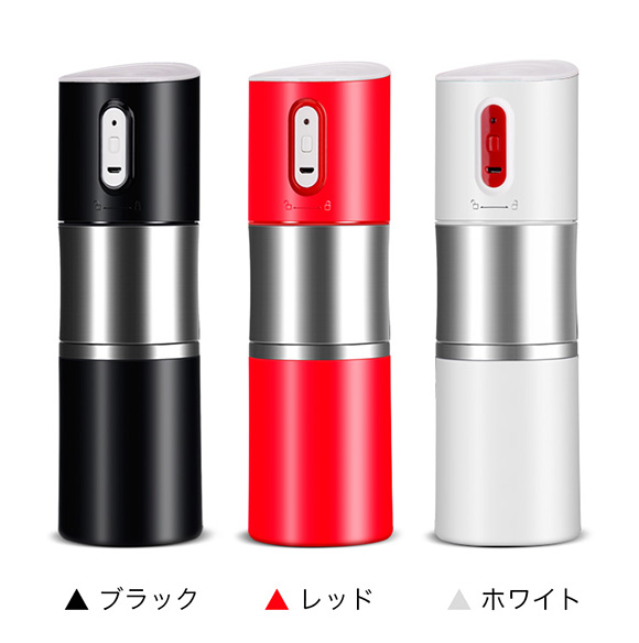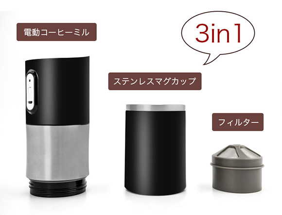 本製品は、挽き立てコーヒー豆の香りを楽しむことができる電動式ポータブルコーヒーメーカー。出張や旅先、アウトドアなどでの利用が想定されている。電動コーヒーミル、ステンレスマグカップ、フィルターの3点がセットになっている3in1モデル。使い方はシンプルで、コーヒー豆を入れて、電源ボタンを押すだけで豆が挽ける。お湯を注げば、コーヒーの抽出が完了。