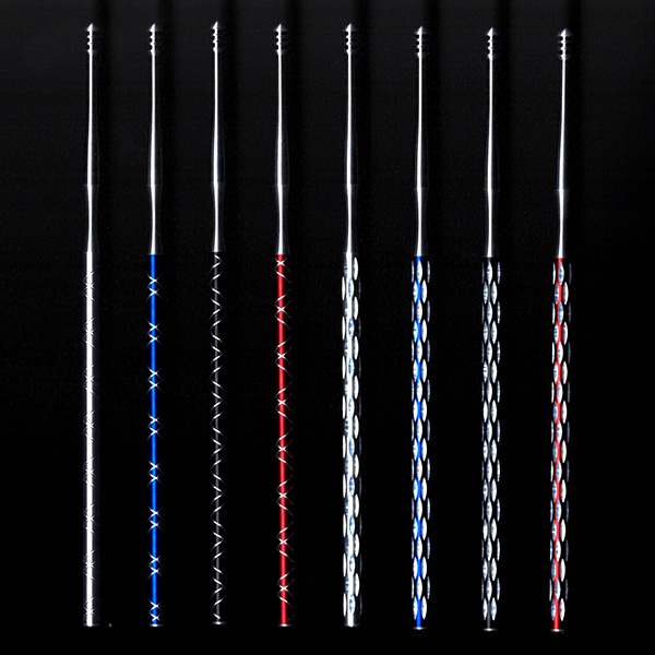原材料となるアルミニウムの表面処理・染色・切削加工まで自社技術を駆使し、ミクロン単位の切削技術で“顕微鏡で見ても凹凸のない形状”を実現。フォルムや文様の美しさに加え、かき心地の滑らかさも魅力となっている。「矢来文」は邪気を払うと言われる文様で、「網代文」は豊かさを意味するもの。後端には江戸切子で「底菊」と呼ばれるカットが施された。配色に用いられた4色も、伝統的な江戸切子のカラーリングになぞらえたもの。細部に至るまで伝統工芸の“本質”が表現されている。