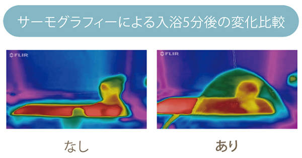 通常の入浴と比べると、5分で体全体が温まってくることが、サーモグラフィーの比較によって実証済だという。サウナ傘をかぶせた状態で入浴することで、徐々に体が温まっていることが色の違いでわかる。サウナ傘の内側の温度だけでなく、体もきちんと温まっているようだ。