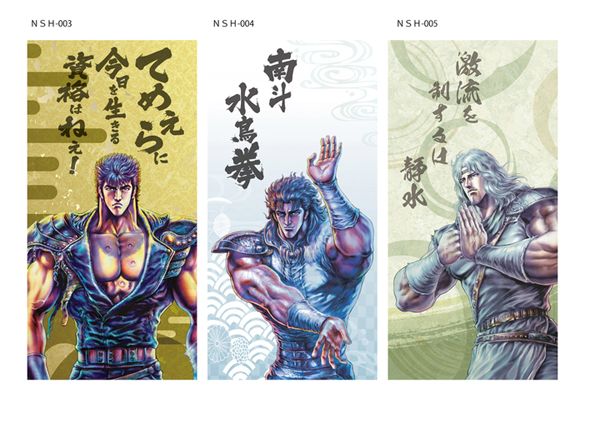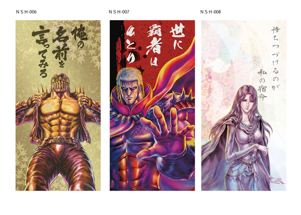 1枚用タイプは、北斗4兄弟である「ケンシロウ」「ラオウ」「トキ」「ジャギ」に、南斗六聖拳の「レイ」と、ヒロイン「ユリア」を加えた計6柄。厳選された人気キャラクター達が名セリフとともに和室に蘇る。