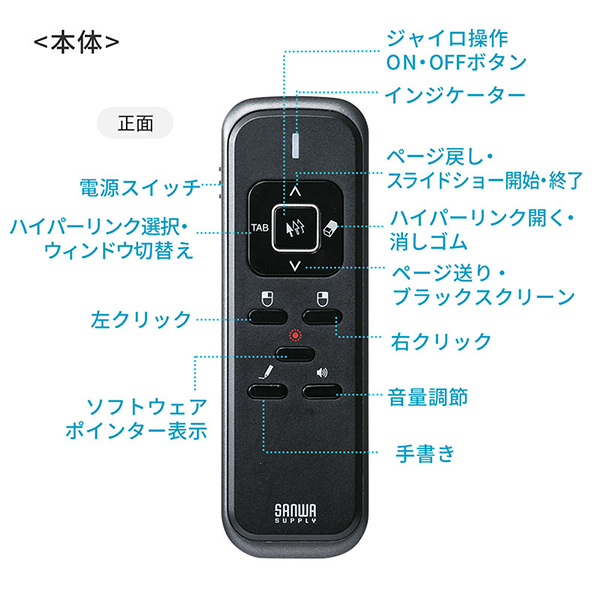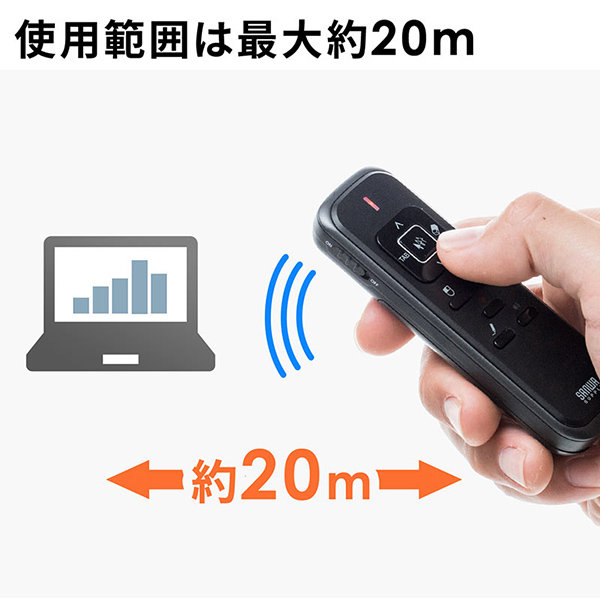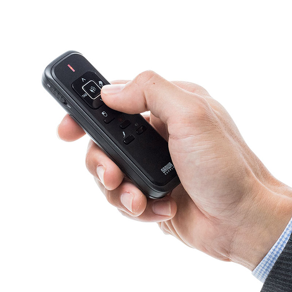 右クリック左クリックといった、単純なマウス操作だけではなく、ページ送りや音量調節と言ったプレゼンに必要な機能を搭載している。プレゼンソフトはPowerPointやKeynoteといった主要なソフトに対応。本体サイズは約W33×D103×H17mmで、重量は約29gとなっている。