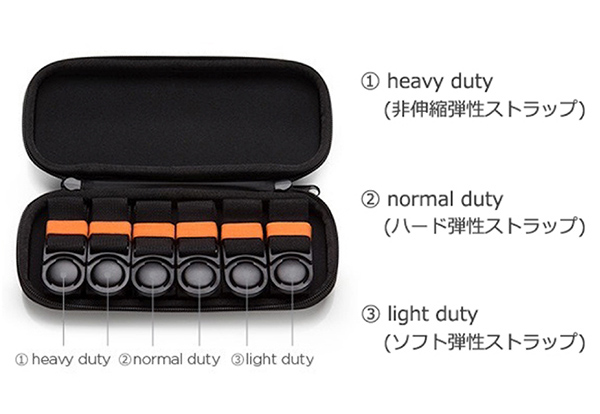 底面は、耐汚、耐衝撃、耐水加工となっており、全体的には耐傷性が高いPUレザーを使用。肩にかかる負荷をうまく軽減するために、3種類のストラップが付属している。9kg以上のときに使用するheavy duty(非伸縮弾性ストラップ)や重量が4.5kg以下のときに使用するlight duty(ソフト弾性ストラップ)など、用途によって使い分けることで、快適にバックパックを背負うことができる。