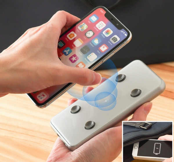 本製品は、無線充電に対応したモバイルバッテリー。本体に備えられた4つの吸盤にスマホをくっつけることで、横置きはもちろん縦置き状態でも無線充電を実行できる。
