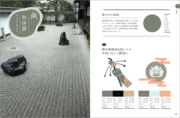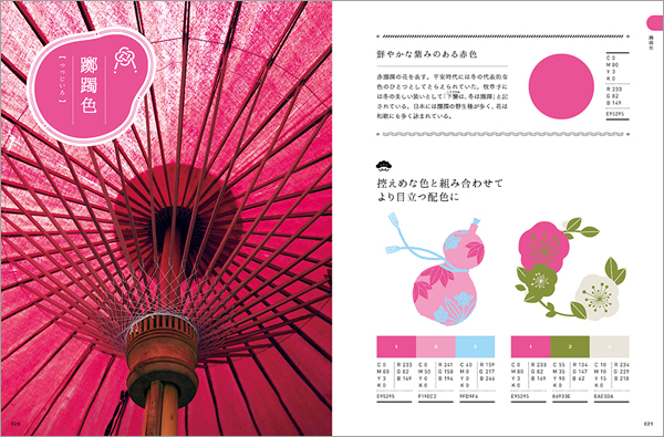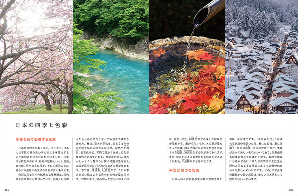 古くから伝わる伝統的な和色のうち46色のキーカラーについては、ユニークなイメージビジュアルと豊富な配色パターンも掲載。また、日本の自然美を反映したカラーリングが見てとれる季節ごとの「かさね色目」30色を紹介しており、日本特有のカラーリングや美的感性を、自分の作品にも手軽に活用できる構成となっている。