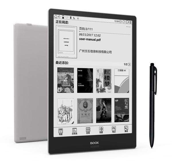 今回の最大サイズとなる「Boox Note Plus」は10.3インチ(A5相当)のEinkパネルを搭載し、解像度は1872×1404ピクセル(227 PPI)、ストレージ32GB、バッテリー容量4100mAhで、ワコム製4096段階筆圧検知機能付きの電磁誘導方式スタイラスが付属する。価格は59,800円(税抜)。