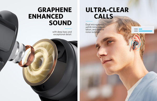 最先端のグラフェン採用ドライバーとパッシブノイズキャンセリング機能を搭載した、没入感溢れるクリアサウンドが特徴で、通話機能にも強化が図られており、ノイズリダクション対応マイクを2つ内蔵することで賑やかな場所でも快適な通話を実現している。