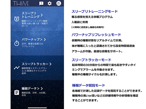 本製品では、4種類のモードが用意されている。眠りに落ちる感覚を繰り返す「スリープリトレーニングモード」、昼の仮眠しすぎを予防する「パワーナップリフレッシュモード」、最も起きやすいタイミングでアラームが作動する「スリープトラッカーモード」、計測データを閲覧できる「睡眠データ閲覧モード」が使用できる。販売価格は23,800円(税込)で、THIM公式サイトなどで購入が可能。