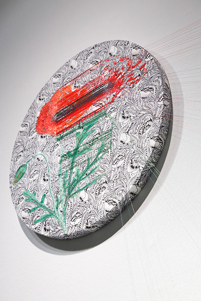 京都生まれの宮田彩加氏は、2012年に京都造形芸術大学大学院 芸術表現専攻 修士課程 染織領域を修了した。大学で染織を専攻したことをきっかけに、染めた布に奥行やボリュームを出すための手法として、手刺繍やミシン刺繍によるオリジナルテクニックを使った制作を開始。本展では、均一な針目で一針ずつ構築させていくことが前提のミシン刺繍において、あえてエラー(バグ)を起こすことで糸の層を出現させた「WARP」シリーズと、支持体の布をなくして糸だけで構築した「Knots」シリーズなど、新作をメインとして、京都では初出品となる作品を紹介している。