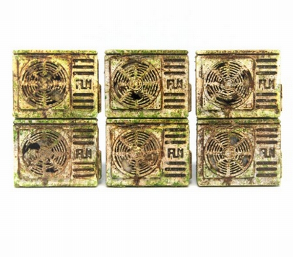「室外機バッジ(廃墟)」は廃発電所をイメージして加工したアイテム。数十年、もしかしたら数百年の時を経たかのような、錆、腐食具合、苔の侵食具合が絶妙だ。サイズは幅37×奥行き13×高さ28mm。