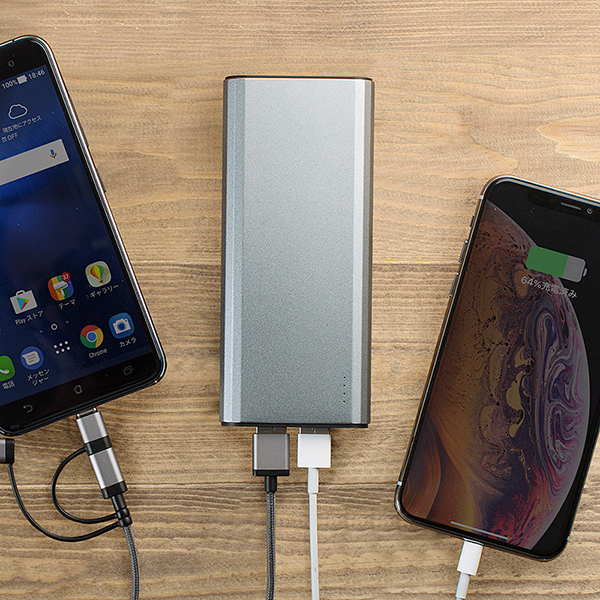 本製品は、USB2ポートを搭載した大容量モバイルバッテリー。容量が10,000mAhなので、iPhone XSなら約4回、iPad 9.7インチなら約1回の充電をすることができる。アルミ筐体のスタイリッシュなデザインと手に馴染むラウンドエッジ構造で、見た目だけでなく使いやすさも優れている。付属の3in1ケーブルは、Lightning、microUSB、Type-Cの各種コネクタに対応。また、断線しにくいナイロンメッシュケーブルと丈夫なアルミ製コネクタを採用している。