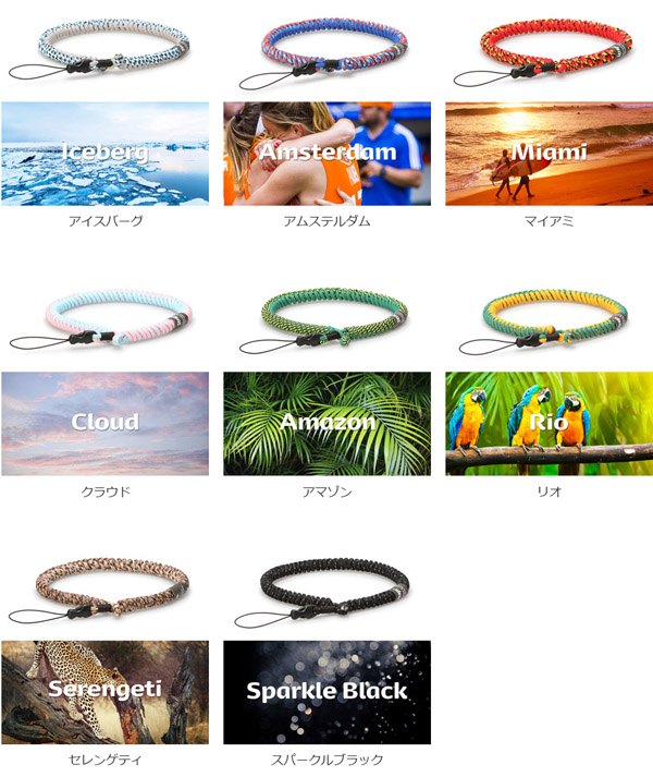 今回発売されるのは、地域や自然をモチーフにした色彩豊かなカラーバリエーションで、アイスバーグ/アムステルダム/マイアミ/クラウド/アマゾン/リオ/セレンゲティ/スパークルブラックの全8種。デジタル機器はもちろん、バッグや傘などにつけても楽しめるカラフルなラインナップとなっている。