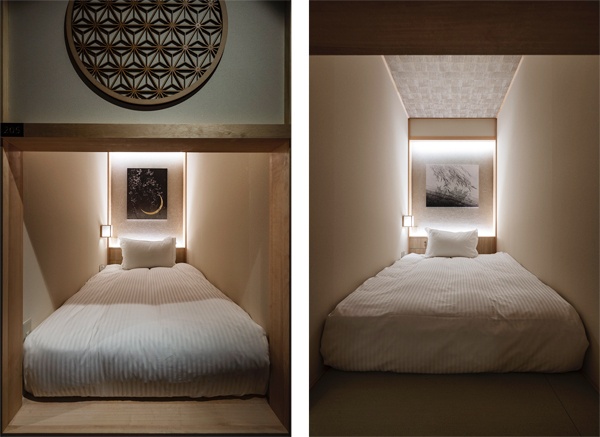 同ホテルは、16世紀後半に千利休が生み出した茶室の傑作「待庵」を、21世紀型に再解釈した和モダンなカプセルホテルだ。全7フロアにわたる館内には、ベッドサイズや部屋の広さに応じて5種類・計78の客室が設けられており、建築家が国内クリエイターと共創した日本のファッション・アート・飲食体験を含むくつろぎの宿泊体験を提供する。各客室は天井高が2メートル以上あり、シモンズ・ベッドを取り入れ、壁には日本画が飾られるなど、ミニマルな空間でありながら上質な和体験が楽しめるのが特徴だ。