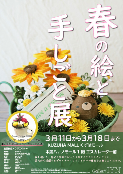 2019年3月11日(月)から3月18日(月)まで、KUZUHA MALL 本館・ハナノモール1Fのエスカレーター前にて「春の絵と手しごと展」が開催される。入場無料のアートフェア。多彩なジャンルの作品を、じっくりと鑑賞したうえで購入できる。時間は10:00~21:00。