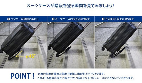 旅先での移動、高低差や段差が多いホテルなど、スーツケースを抱えての移動は意外と大変なもの。同製品は、そんな時に重宝する、荷物を持ち上げることなく階段の上り下りができるスーツケースである。
