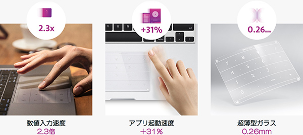 「Nums(ナムス)」を指でスワイプすると計算機が立ち上がり、トラックパッド部分をテンキーとして利用できる。ランチャー機能を搭載しており、お気に入りサイトやよく使うソフトをスワイプで立ち上げることが可能。本製品の素材には、アルミノシリケートミネラルガラスを使用しており、防水・防火・スクラッチフリーである。薄さ0.26mmのシートなので、貼り付けたまま持ち運びができる。