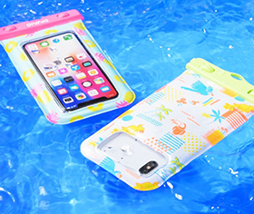 本製品は、約縦16×横8×厚1cm以下のスマートフォンを収納可能。本体サイズは、約縦21×横11.5×厚1.7cmである。ケースに入れた状態で、画面操作・写真撮影・通話ができる。カラーバリエーションは、「トロピカルバード」と「パイナップル」の2種類。なお、耐水温度は-10~45℃なので、幅広い水温での利用が可能である。