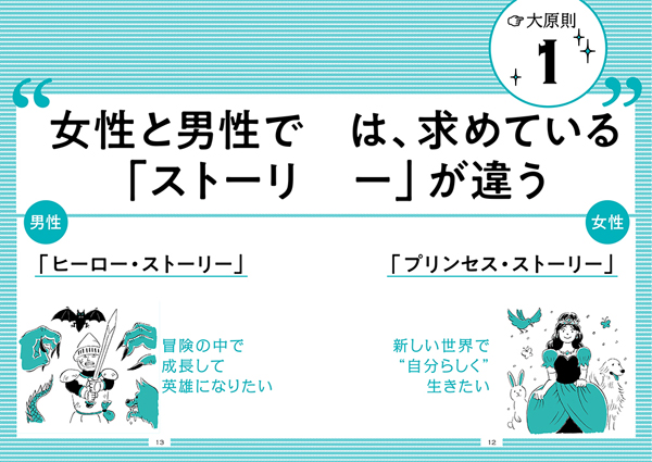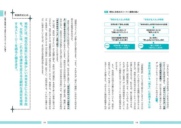 本書のテーマは女性向けマーケティングだが、女性独特の心理を説明する過程では、当然「男性は」「女性は」と比較しながら、それぞれに合ったマーケティング手法を解説していくことになる。そのため、読み進めるほどに、女性向けストーリーとともに、男性向けにはどういう要素を見せれば売れやすくなるのか――も必然的に理解できてしまう点も特徴である。男性客、女性客の両方に響くハイブリッド型の見せ方も紹介。これ一冊で、ターゲット顧客にピッタリと焦点のあったマーケティング手法が身に着けられる、お得な一冊となっている。