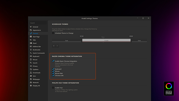 「Vivaldi」は、これまでにもv1.5でスマート照明「Philips Hue」との色のシンクロ機能を提供しており、今回いち早く「Razer Chromaライティング」への対応も実現した。より没入的でパーソナルなブラウジング体験を提供することが狙いだ。[環境設定]→[テーマ]で「Razer Chroma」対応を有効にしたり、どのデバイスを同期させるかを選択したりが可能。「Vivaldi」のテーマに合わせて、「Razer Chroma」デバイスを特定の色に固定することもできる。