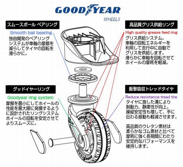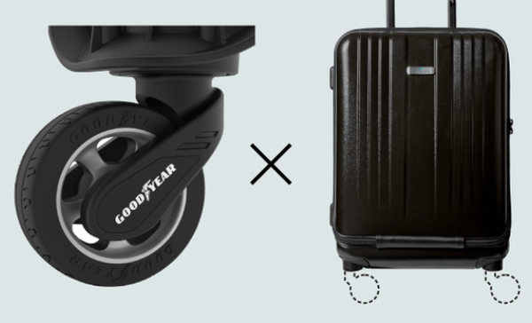 F1ファンならずとも、一般ユーザーにも認知度が高い、タイヤメーカー・グッドイヤー。F1歴代優勝回数1位の記録を誇る信頼のメーカーが、スーツケースのホイール、キャスターを手掛けた。