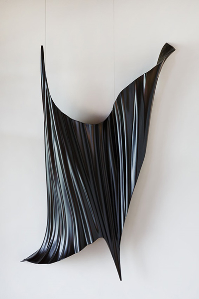 漆の造形表現を追求する中で、井川氏は近年ではヤシの葉を造形材とし、自然の形を積み上げたり貼り合わせたりしながらの制作を展開。自然の形を生かして成形しながら、その過程で生まれる偶然性をも捉えたシャープで独特なフォルムを見出している。風、光、水といった自然を彷彿とさせる形や、幾重もの闇が堆積したような漆黒は、同氏の作品の大きな特徴。漆という素材が秘めた原初のエネルギーと太古の記憶を現代に呼び起こすかのような壮大なスケール感で、鑑賞者を魅了する。